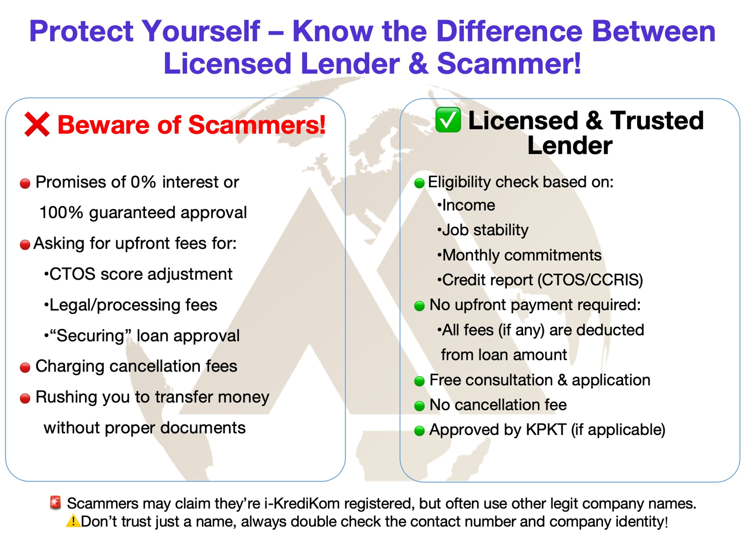 Kami juga bekerjasama dengn lebih 110 lebih syarikat-syarikat pinjaman wang berlesen dan kredit komunity di bawah KPKT untuk menawarkan pinjaman peribadi kepada pekerja swasta dan penjawat awam.